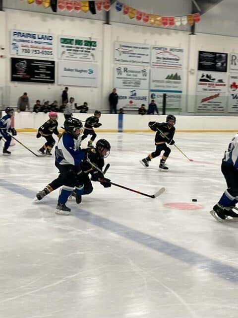 Gavin ‘The Badger’ Brousseau was on the board with four goals and a couple of assists. ‘Awesome Lawson’ Moneta missed the target last week on his breakaway, but made no mistake finding the twine this past Saturday, he scored a couple of goals. Some sensational saves by ‘Little Birdie’ Bowman when it was her turn to guard the cage. Jacob ‘Jake the Snake’ Botstein was stronger on his feet this past weekend and made a great defensive poke check with his stick to stop one of the Canadiens in their tracks. Roseleigh Nepoose -Gadwa had a hard time not getting distracted by all her hockey fans behind the net. Aksel Aarbo didn’t score, but not for lack of effort, she was doing an awesome job of stripping the puck free. Jaxson ‘Jackhammer’ Krankowski slid across the crease on his knees blocking shots for his goalie. Gunnar Kelly on the doorstep just missed scoring with a one-timer. William Farrel, Taber Gadwa, Ryker ‘ Mini Moose’ Ockerman, and Knox Mudryk all played more aggressively than before chasing down the puck at both ends of the rink.