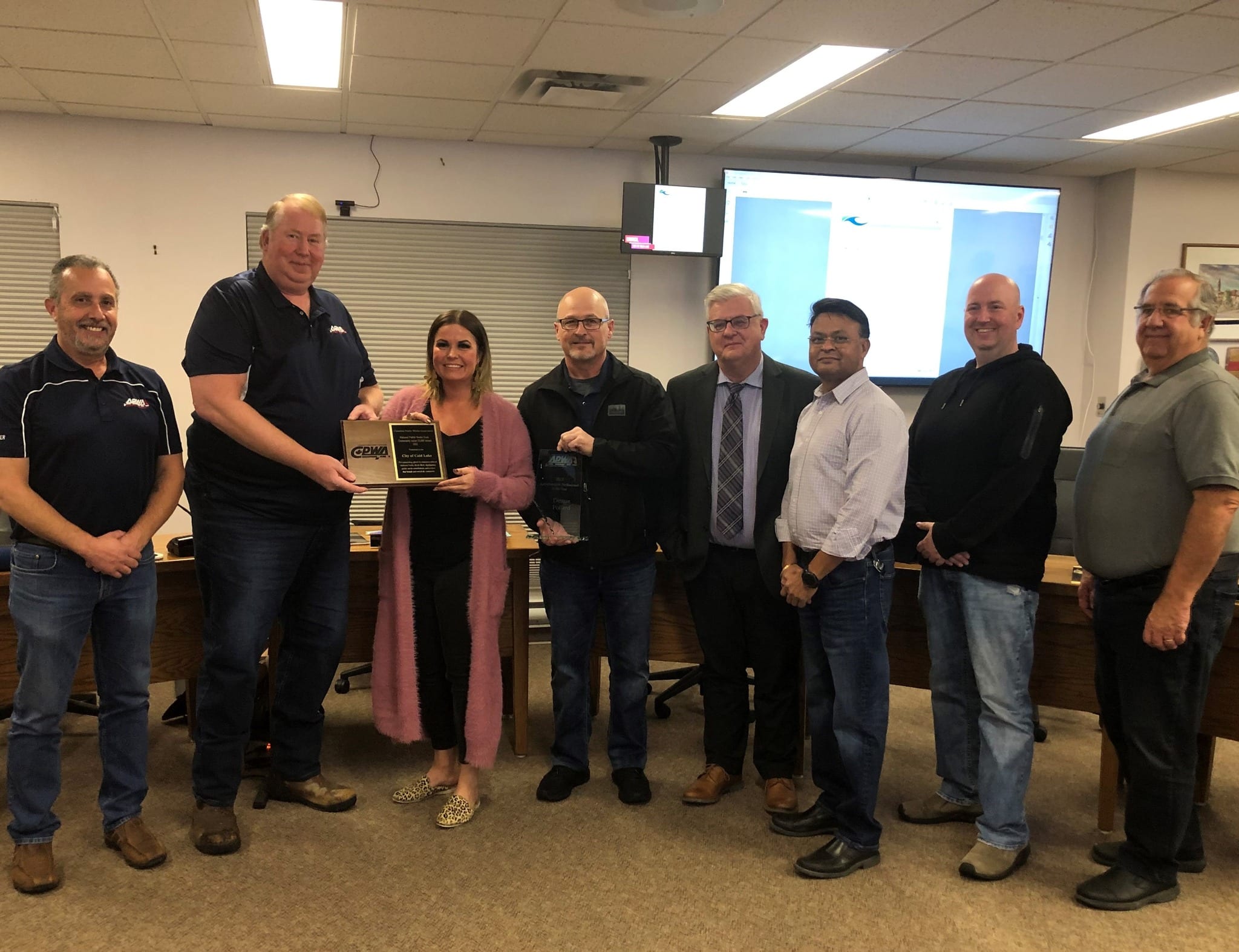 Left to Right: APWA – Alberta chapter president-elect Joe Guideo, APWA -Alberta chapter president Mike Haanen, deputy mayor Adele Richardson, Cold Lake transport services manager, George Urlacher, councillor Bob Mattice, Shailesh Modak, Cold Lake environmental services manger, councillor Ryan Bailey and councillor Bill Parker. Image credit: City of Cold Lake.