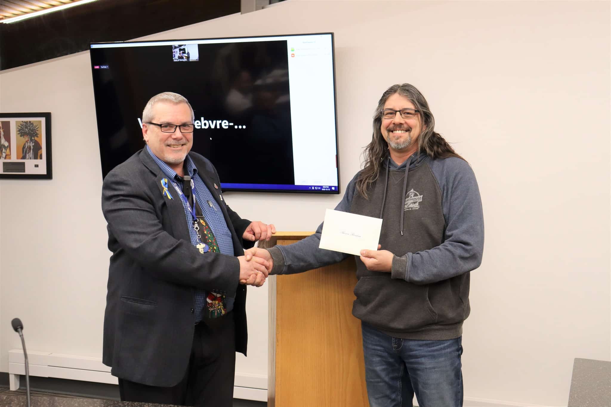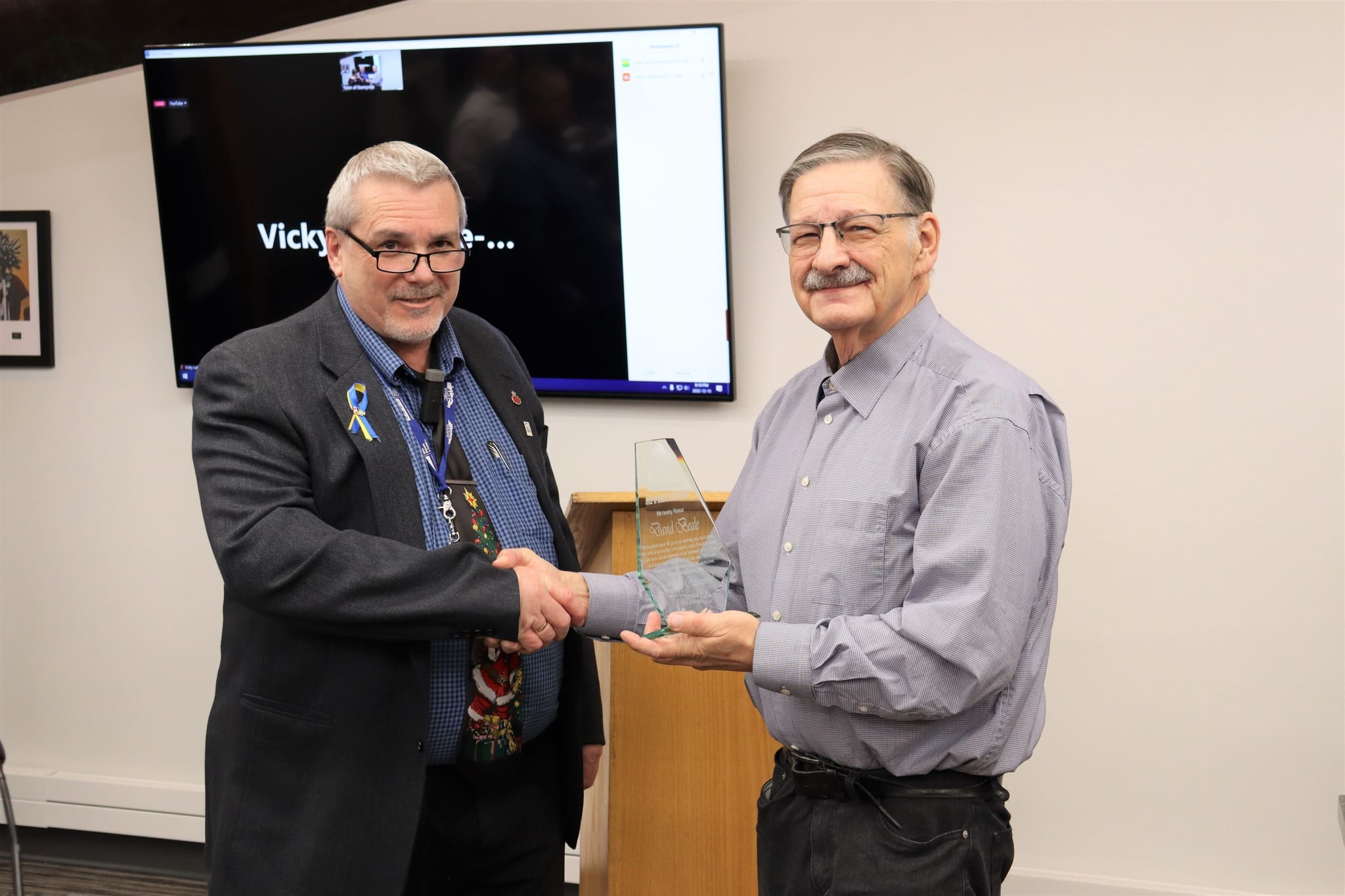 David Beale (right) receives an award for working 40 years in service of the community. Image credit: Town of Bonnyville.