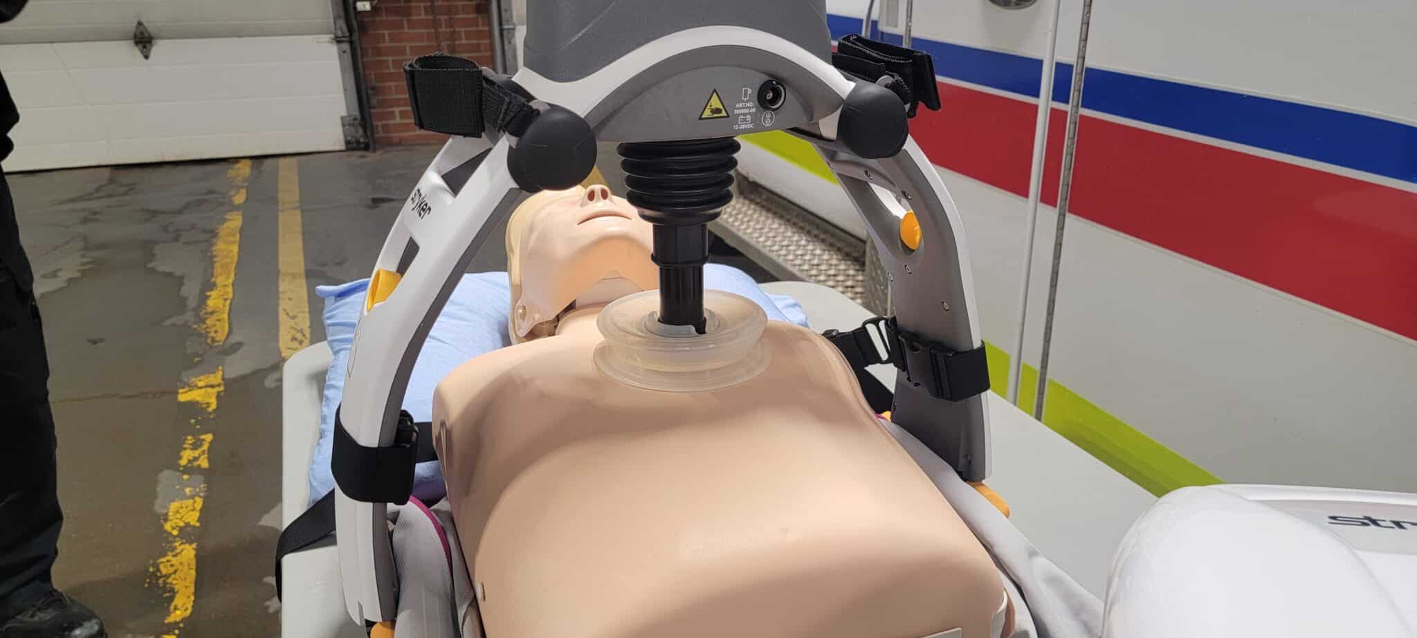 “Once CPR is initiated, the Stryker unit comes out. It’s fully battery battery powered, and does have battery backup once you get into the unit. So I’m just going to turn the unit on really quick, it’s going to do its quick setup. Once the unit is set up on the patient, we’re going to lower the plunger onto the chest. And then we’re just going to hit the button and off the unit goes,” said Hesson.