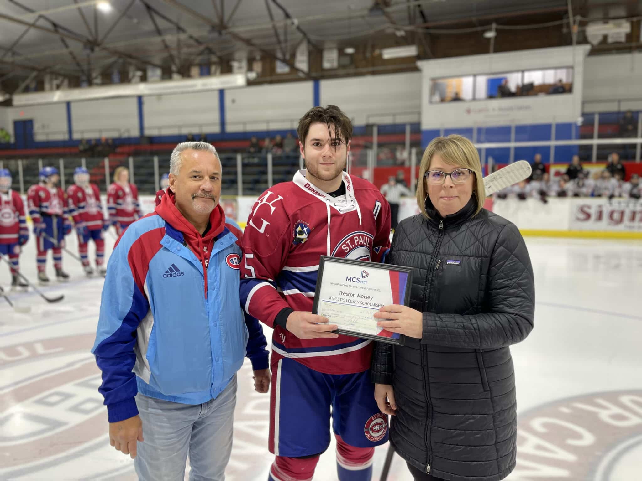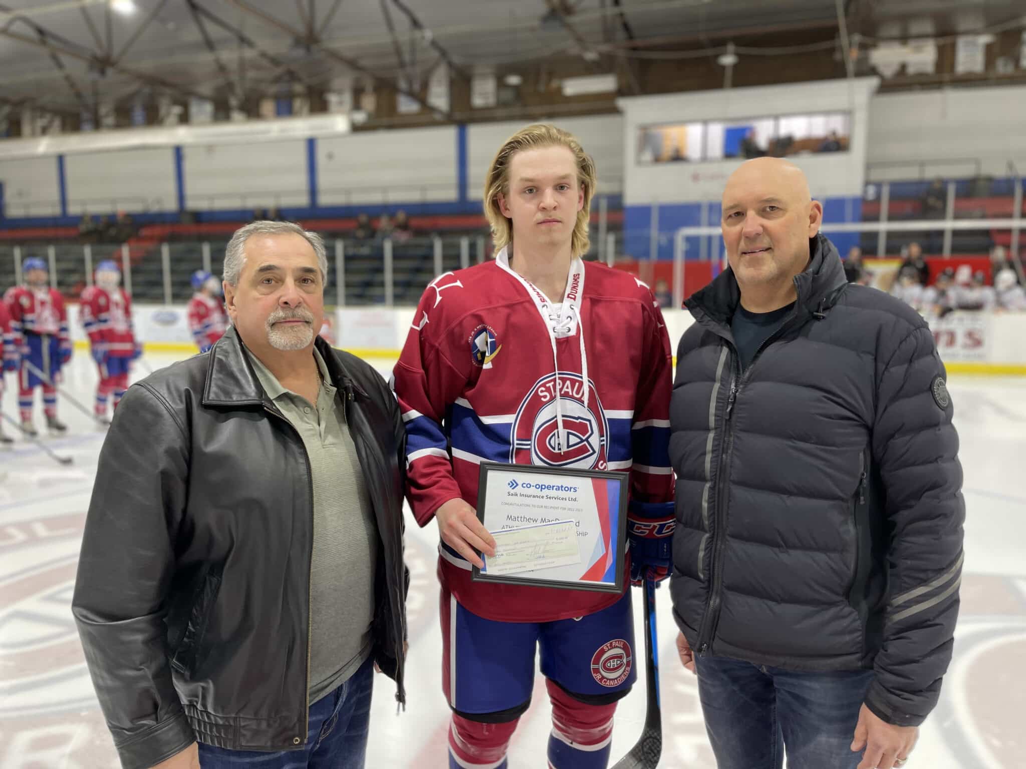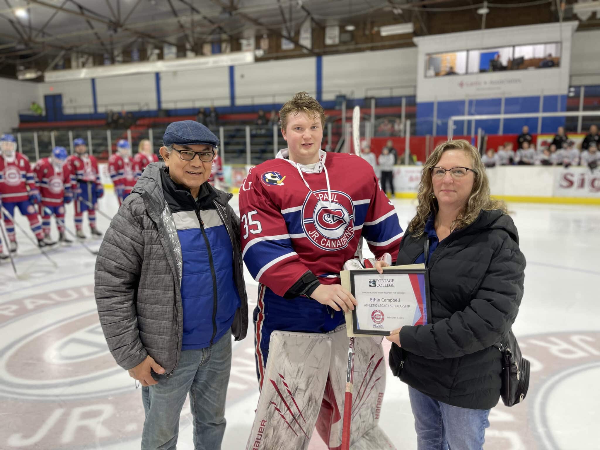 Canadiens players Matthew MacDonald, Treston Moisey, and Ethin Campbell were each presented with Alumni Foundation athletic legacy scholarships on Saturday as well, presented by Saik Insurance – Cooperators, MCSNet, and Portage College.