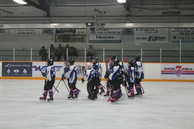This past Saturday was a great day for the Avalanche hockey teams in Elk Point. Not only did all our teams from U7 to U18 have a home game, but they all worked together to raise funds for a good cause. What started as the U15 team’s idea to tape their sticks and socks pink and donate all the proceeds of the 50/50’s to the cause; turned into all the Avalanche teams, the whole day from morning to night, raising money for cancer. And not only the Avalanche teams but the out-of-town teams got involved as well, taping their sticks and socks, etc. pink.