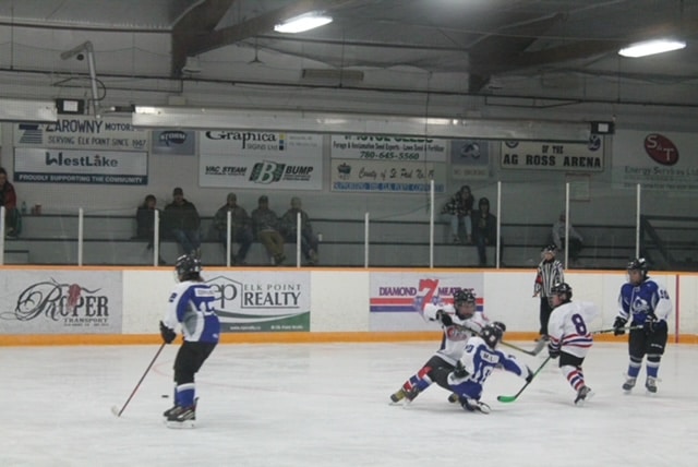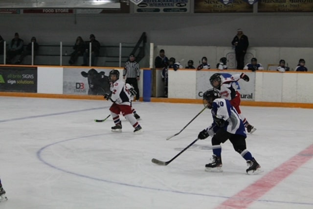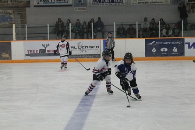 Down in Vermilion early Sunday morning, the U7s played with only eight skaters making the trip. Aksel ‘ Lightning’ Aarbo and ‘Hard Knox’ Mudryk lighting up the lamp with many goals each. Rosaleigh ‘Rosie’ Nepoose-Gadwa with a goal. Cayson ‘Mighty Casey’ Younghans was doing some hard corner work. Towering William ‘Tell All’ Farrel stood tall between the pipes and shut down almost every shot on the net.