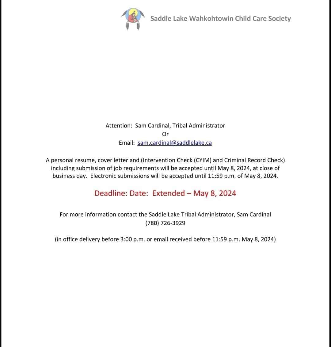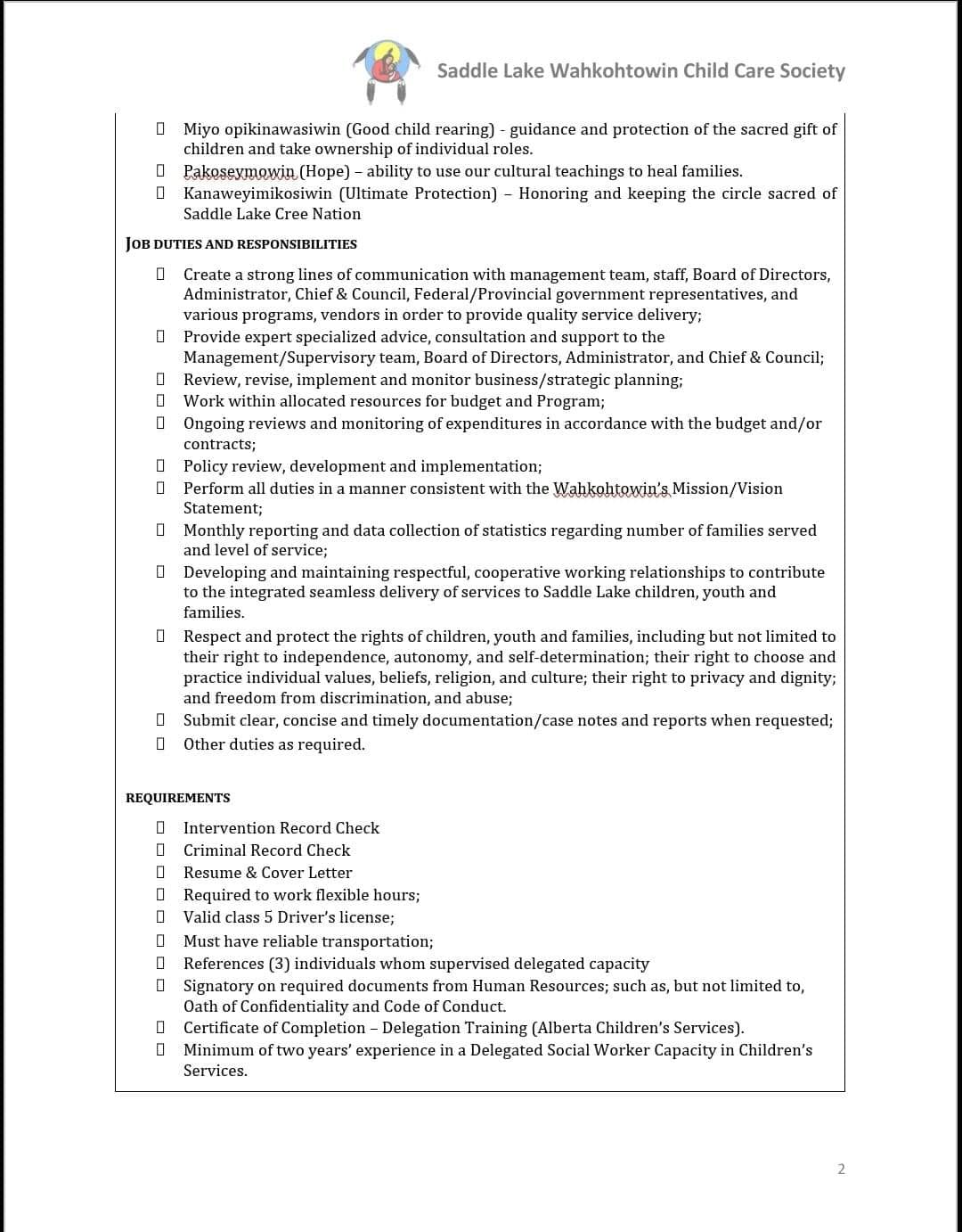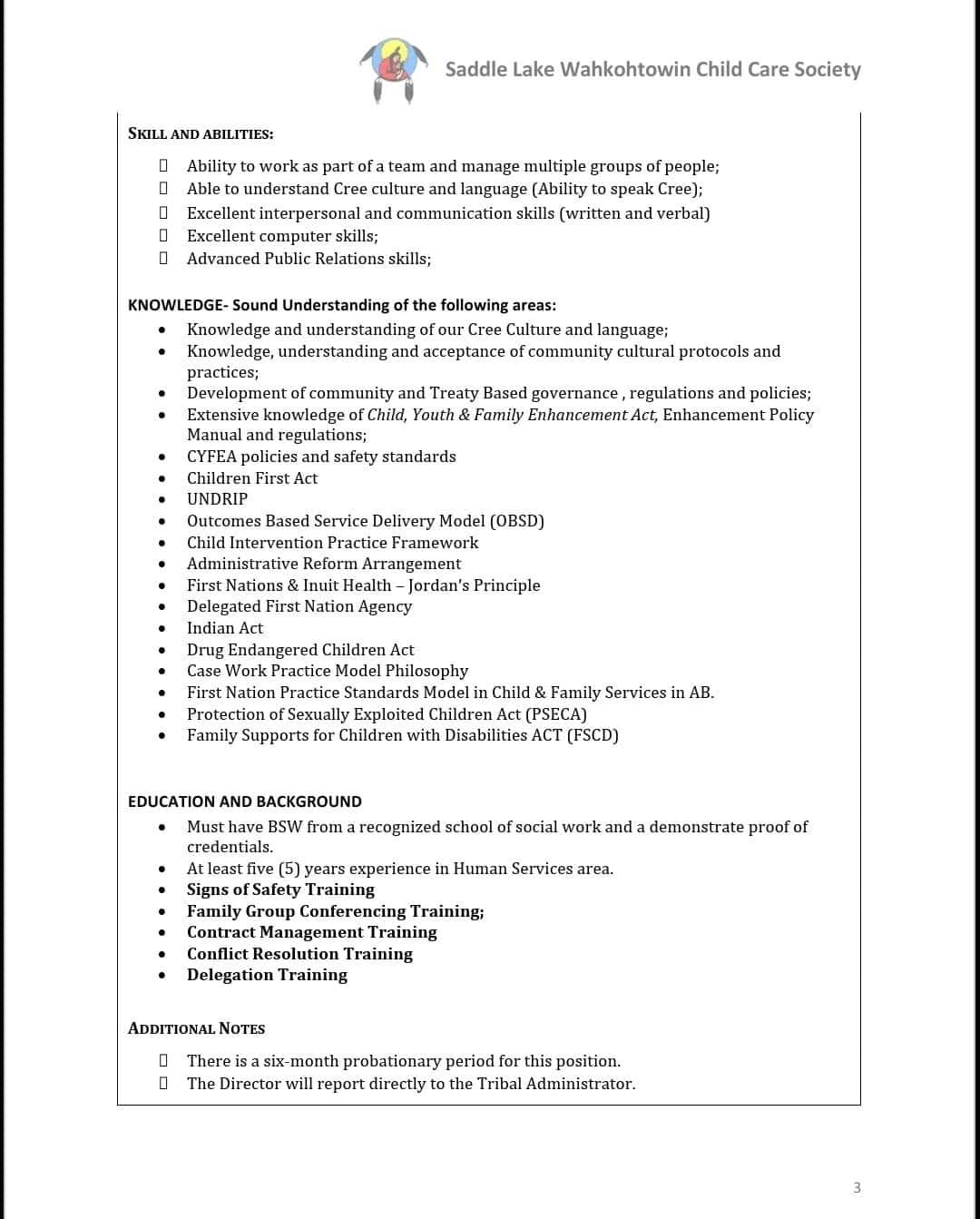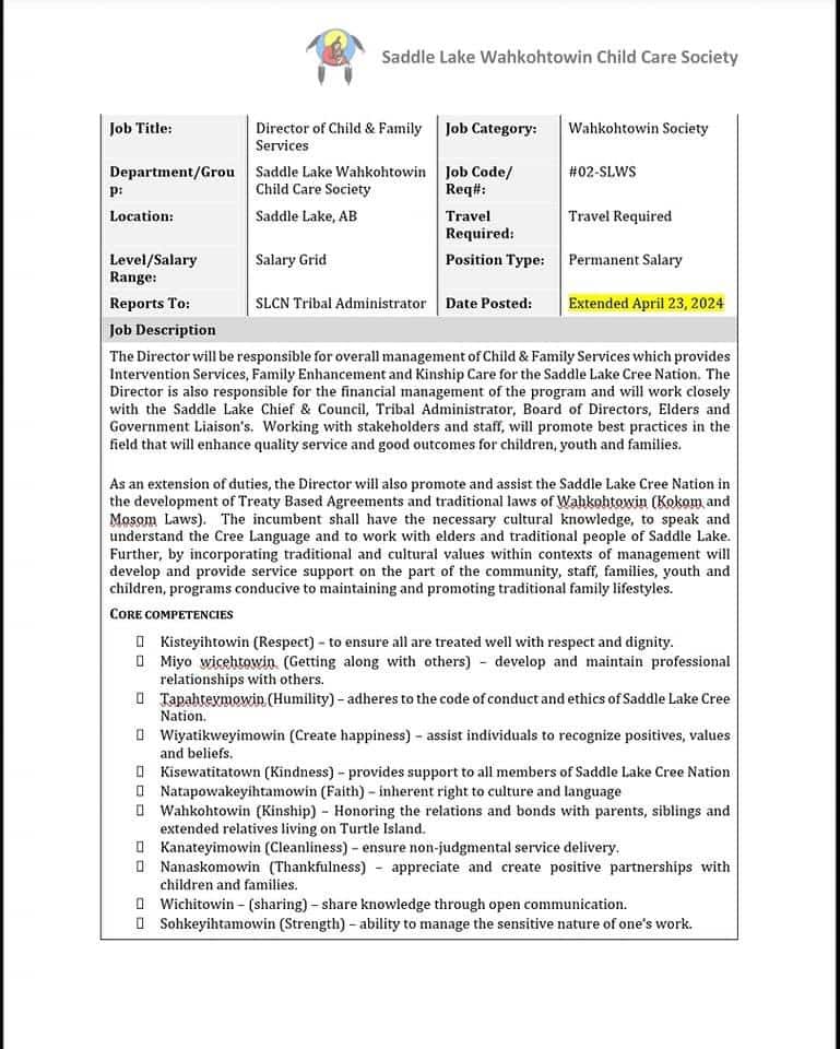 EMPLOYMENT OPPORTUNITY: Director of Child & Family Services – Saddle Lake Wahkohtowin Child Care Society