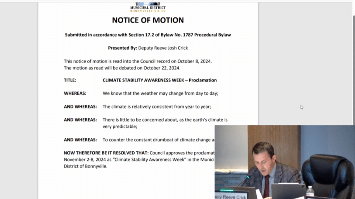 “Whereas we know that the weather may change from day to day, and whereas the climate is relatively consistent from year to year, and whereas there is little to be concerned about as the Earth’s climate is very predictable, and whereas to counter the constant drum beat of climate change activism now therefore be it resolved that Council approves the proclamation of Nov. 2 to 8, 2024 as Climate Stability Awareness Week in the Municipal District of Bonnyville.”