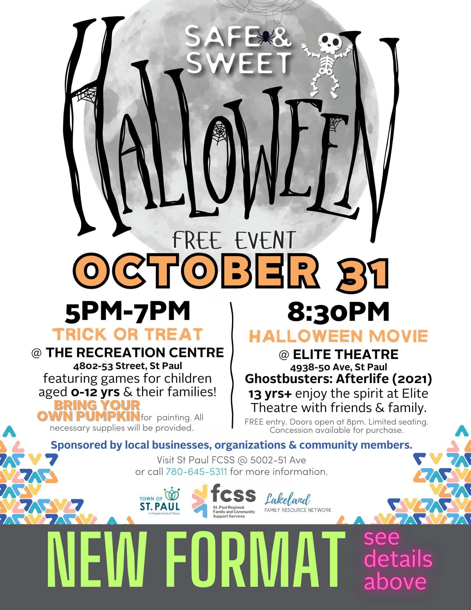 In St. Paul, the Recreation Centre is the home for the Safe & Sweet event with candy and a movie. The trick-or-treating is aimed at kids up to 12 years old from 5:00-7:00PM that includes games as well. If you bring your own pumpkin, they’ll provide the supplies for painting.
