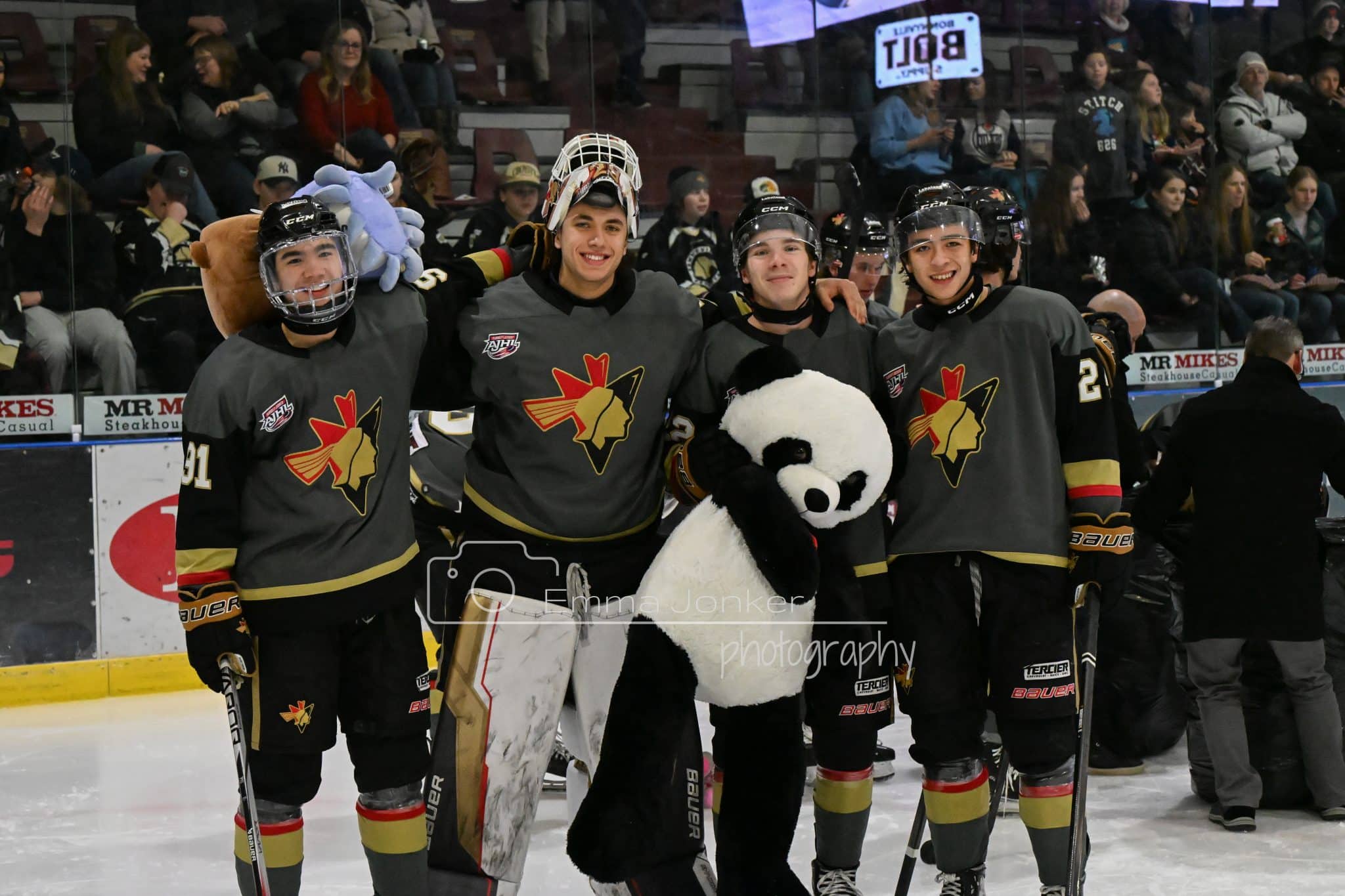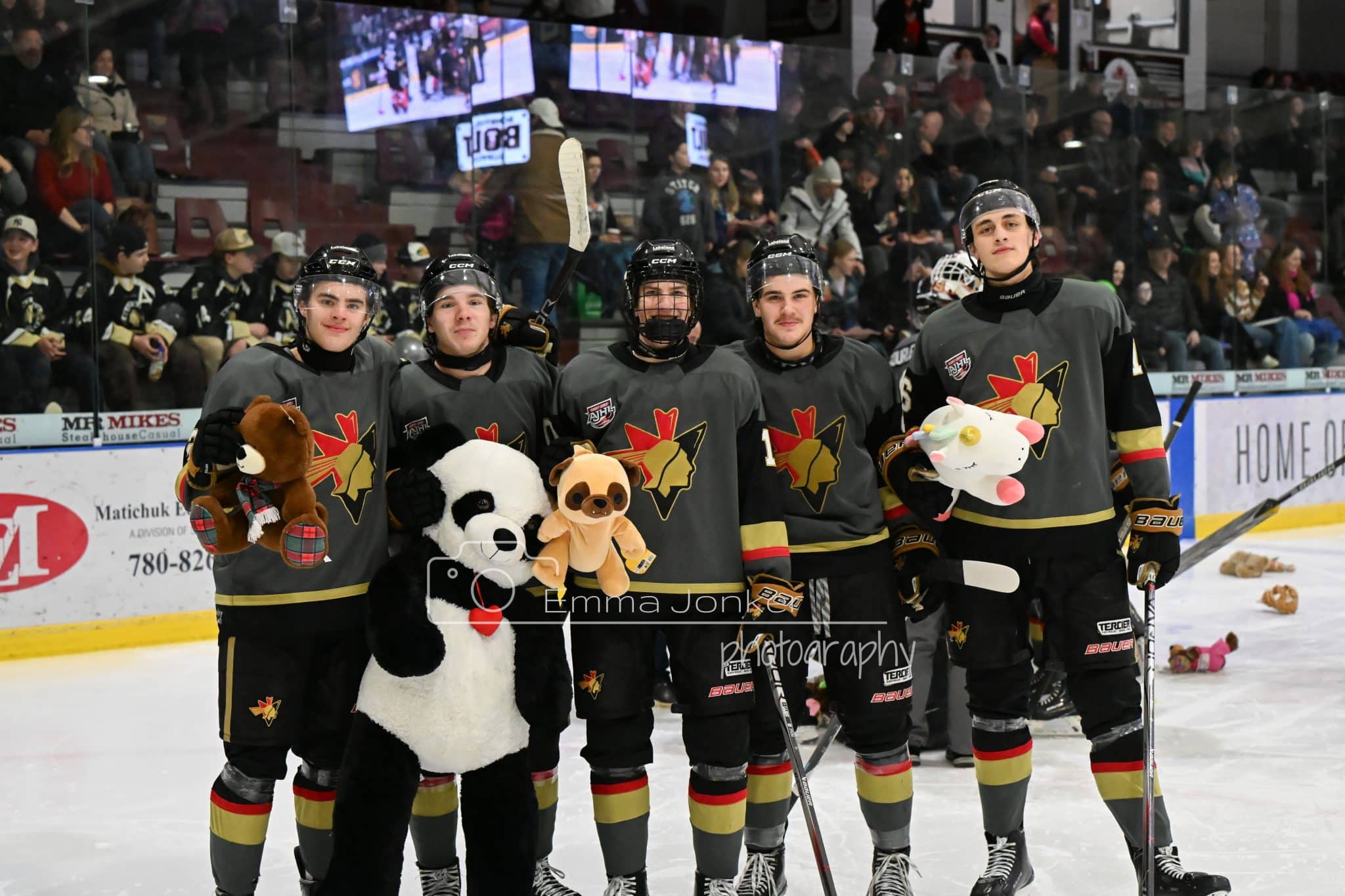 Image: Emma Jonker Photography. Left to right: Christophe Lussier, Slade Firkus, Mat Lajoie, Brent Hoshowski, and Alex Coventry pose after Firkus scores the The Brick Bonnyville Teddy Bear goal.