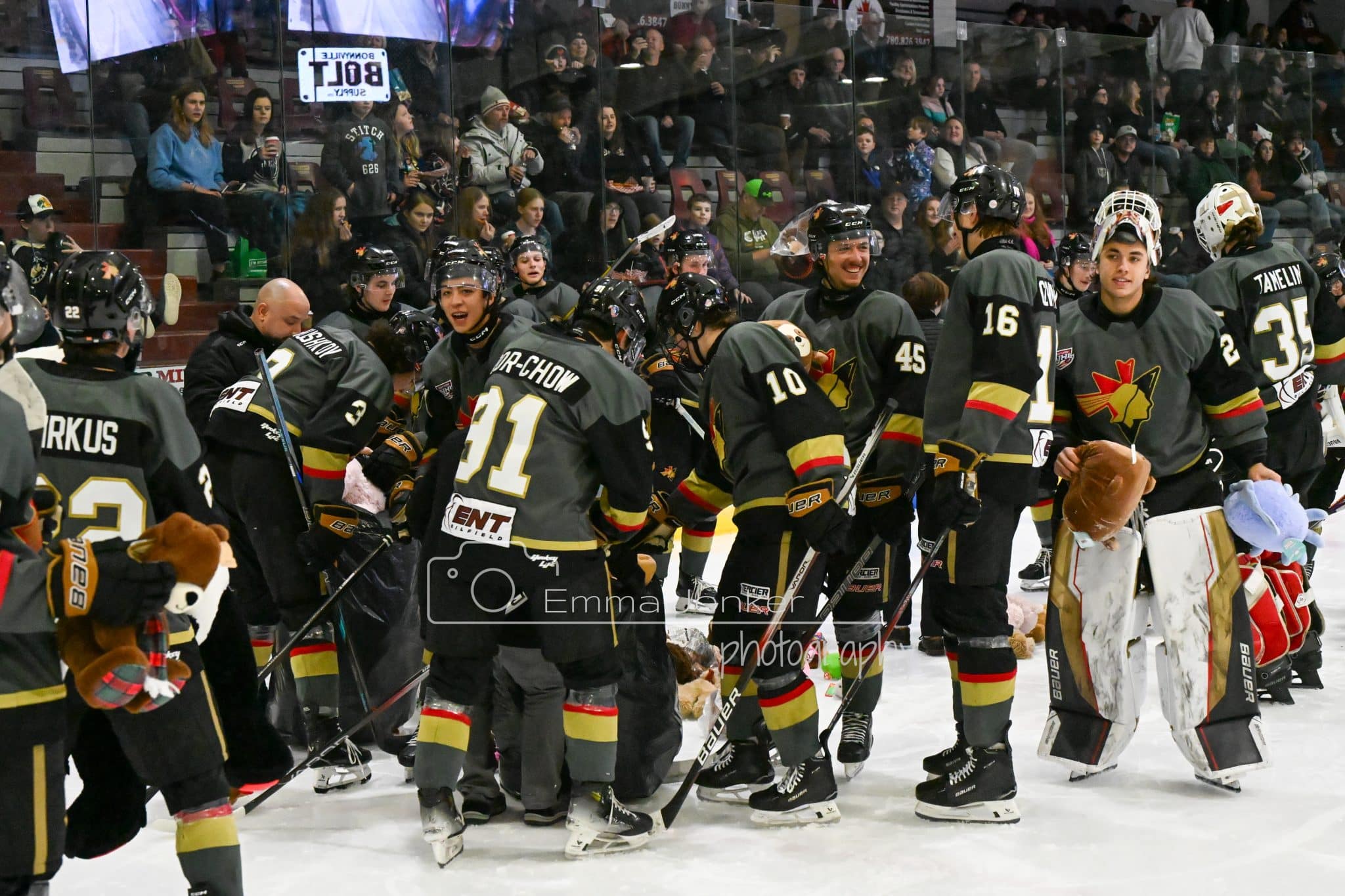 The teddy bears came raining down to the RJ Lalonde Arena ice on Friday night thanks to Slade Firkus, who scored early in the 2nd period to tie the action up vs the Olds Grizzlys.