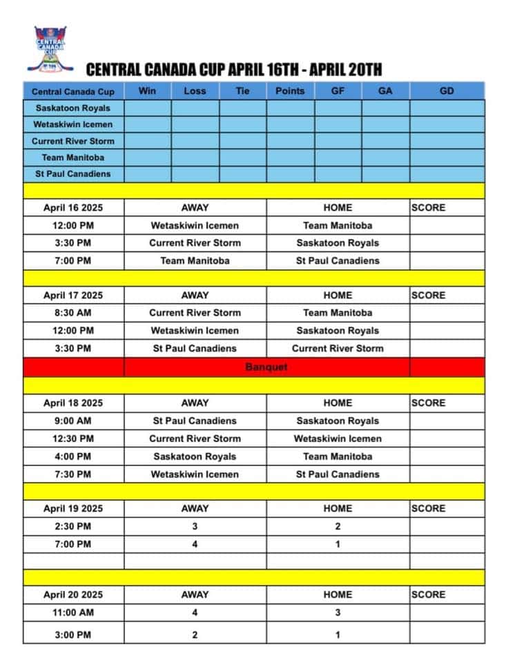 Five teams — the Canadiens, Current River Storm, OCN Storm, Wetaskiwin Icemen, and Saskatoon Royals — comprise the tournament, covering Alberta to Ontario.