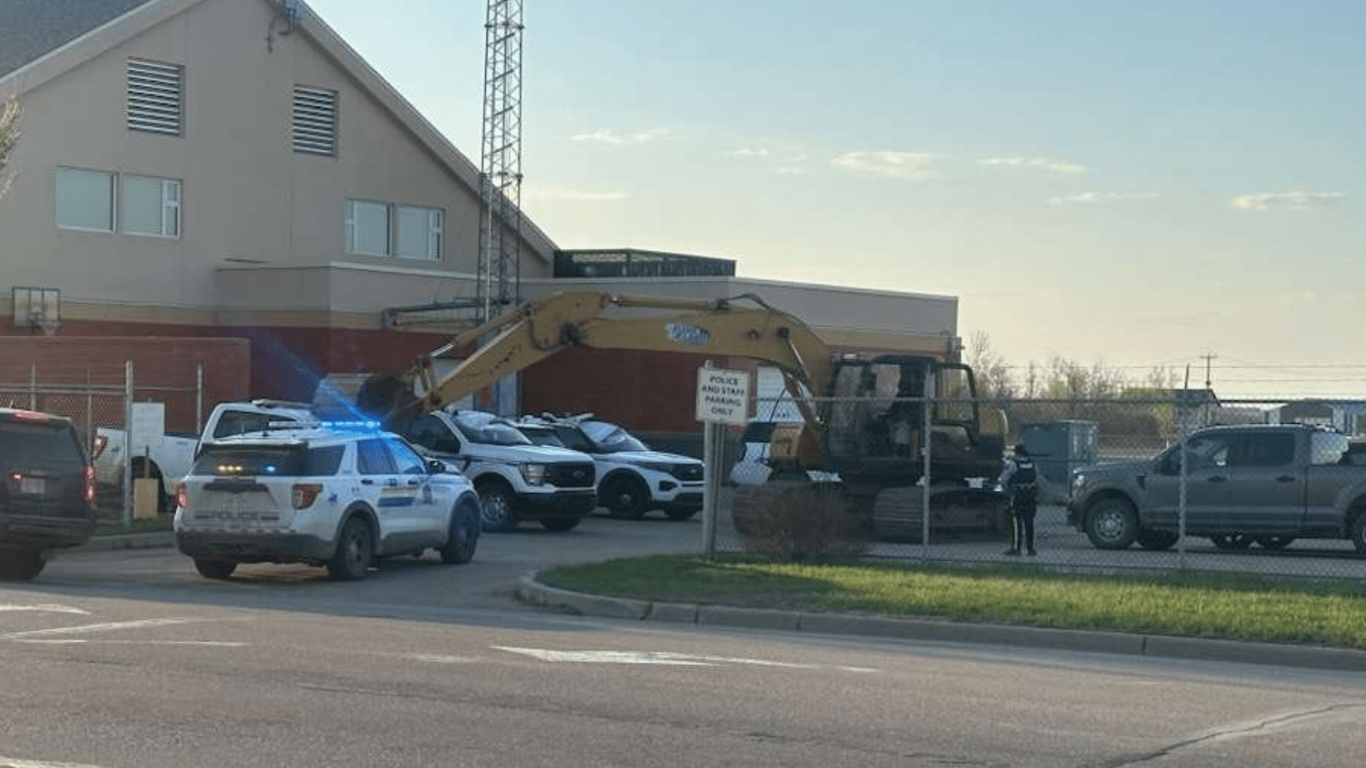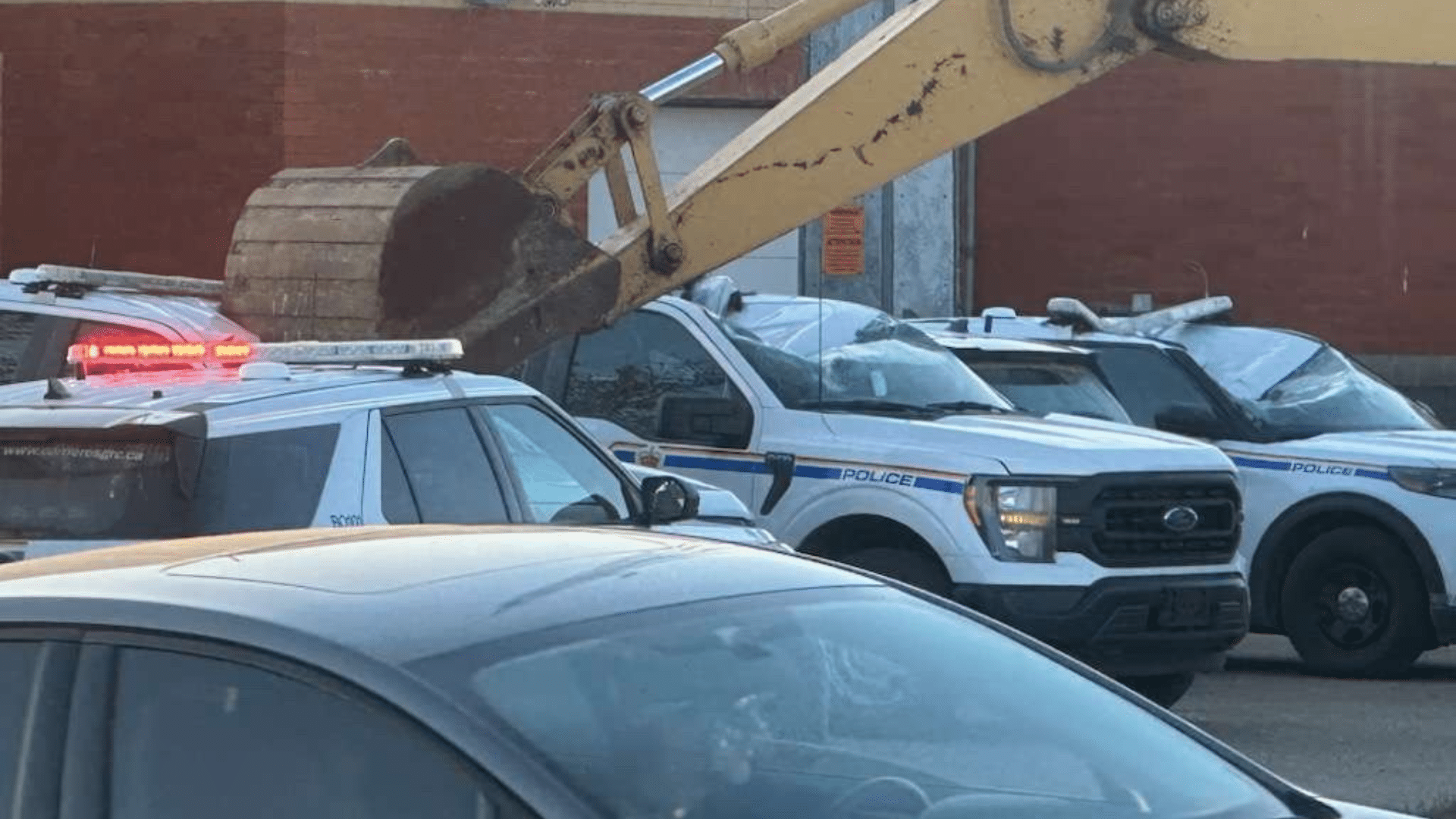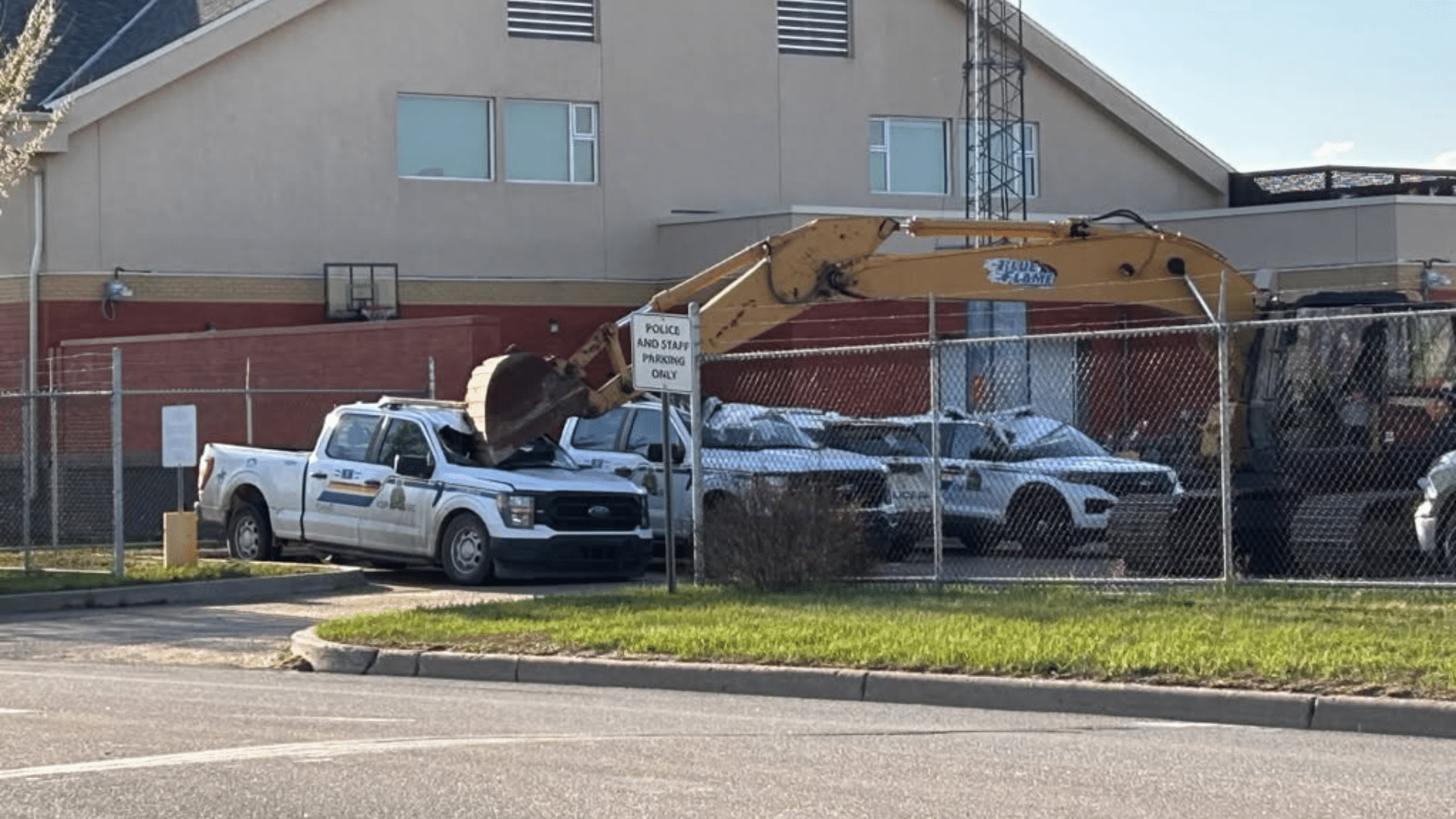 On May 3, 2025, at approximately 6:55 p.m., a male suspect operating a stolen trackhoe entered the parking lot of the Bonnyville RCMP detachment. The individual proceeded to dump several large boulders in front of the prisoner bay and subsequently caused significant damage to five RCMP vehicles parked on the premises. The suspect then fled the scene on foot.