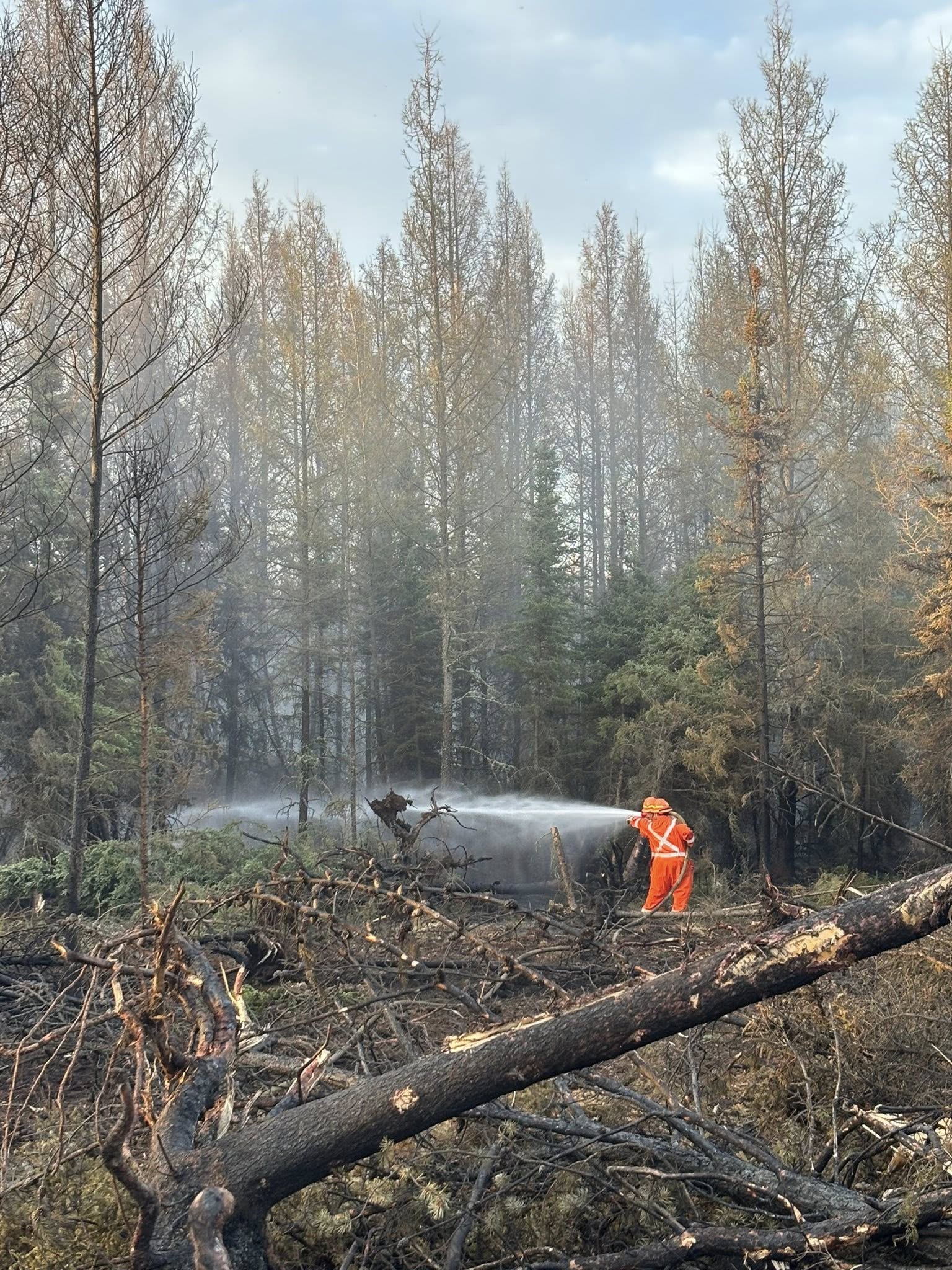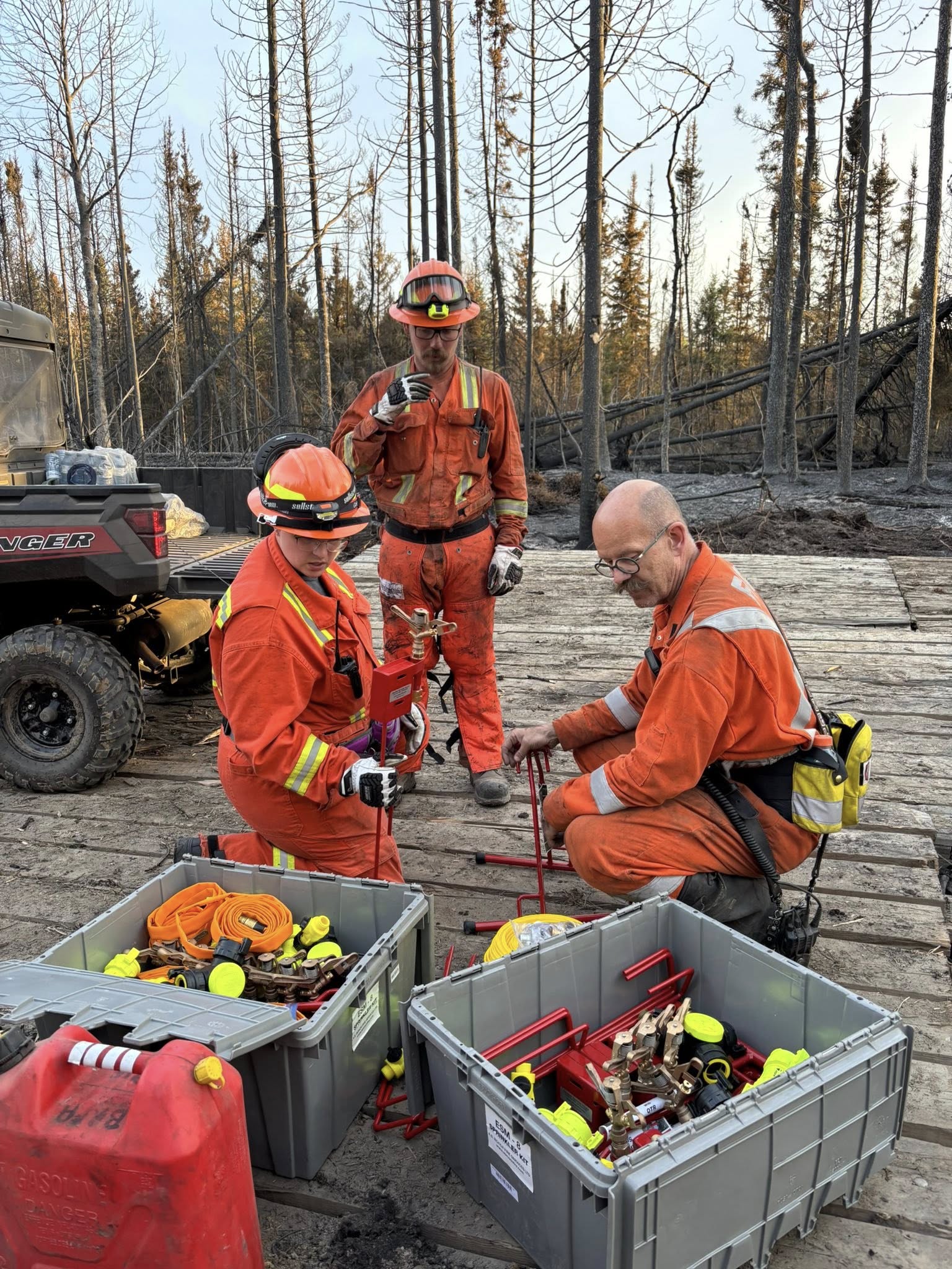 Sprinklers are being installed and will spray water continuously in strategic locations. The M.D. of Bonnyville supplied a large water tank to feed the sprinklers. Work continues on cleanup and site remediation.