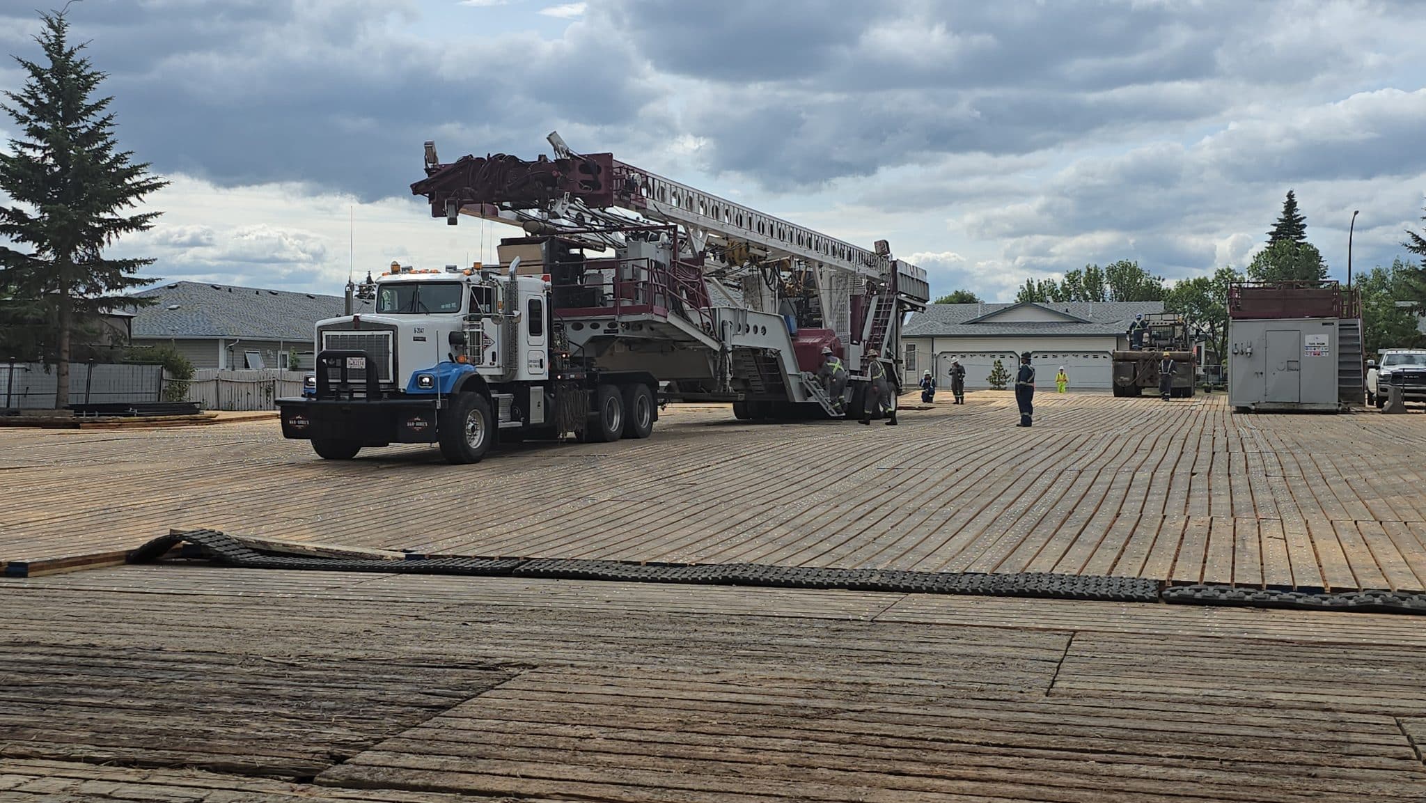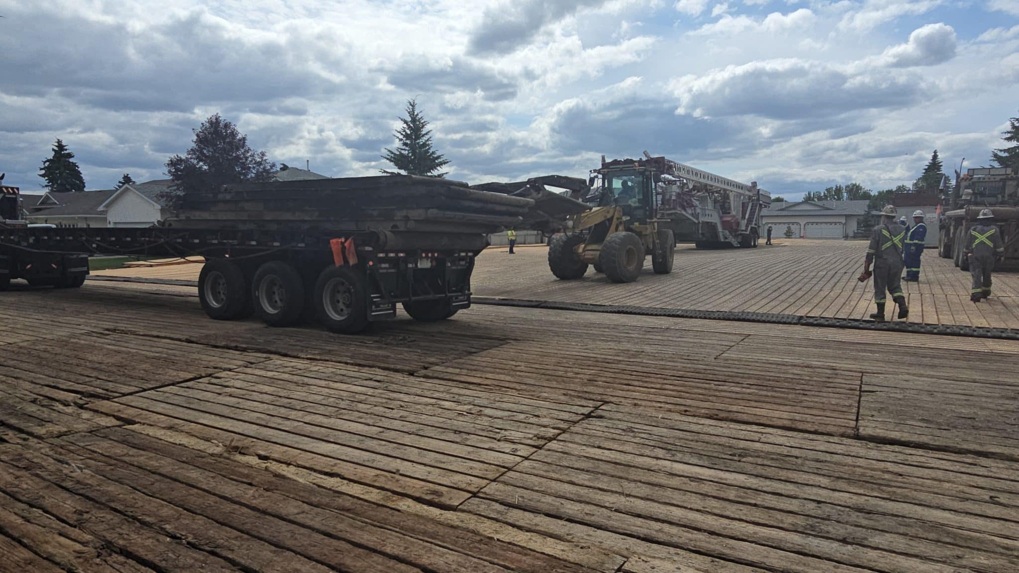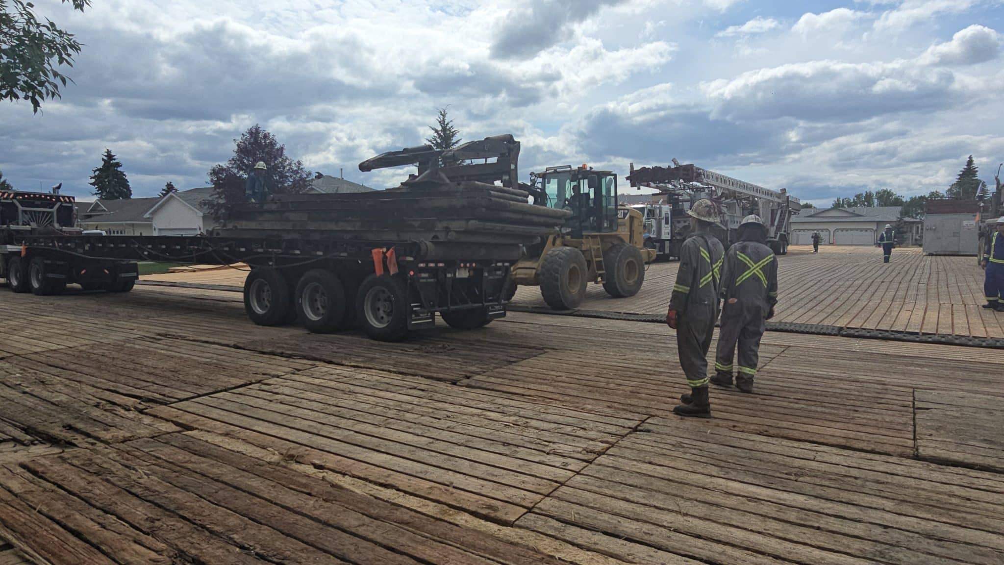 At the worksite, expensive rig matting with brand new wood is laid out where two houses and a duplex once stood. Those properties were previously purchased by the OWA and demolished to make way for the work.