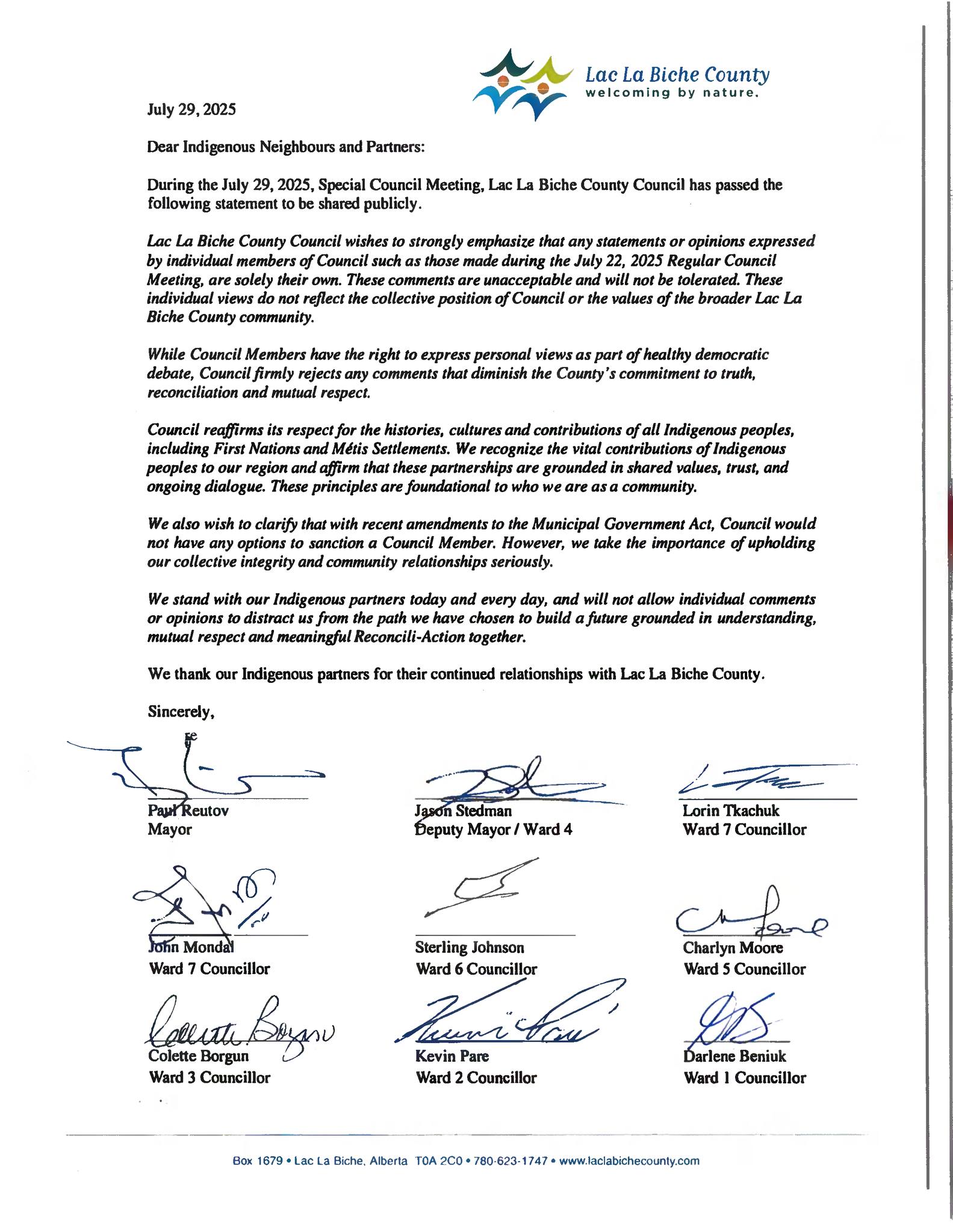“These individual views do not reflect the collective position of Council or the values of the broader Lac La Biche County community.