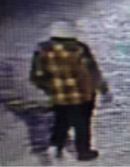 Surveillance footage shows one suspect wearing yellow plaid clothing with a face covering.