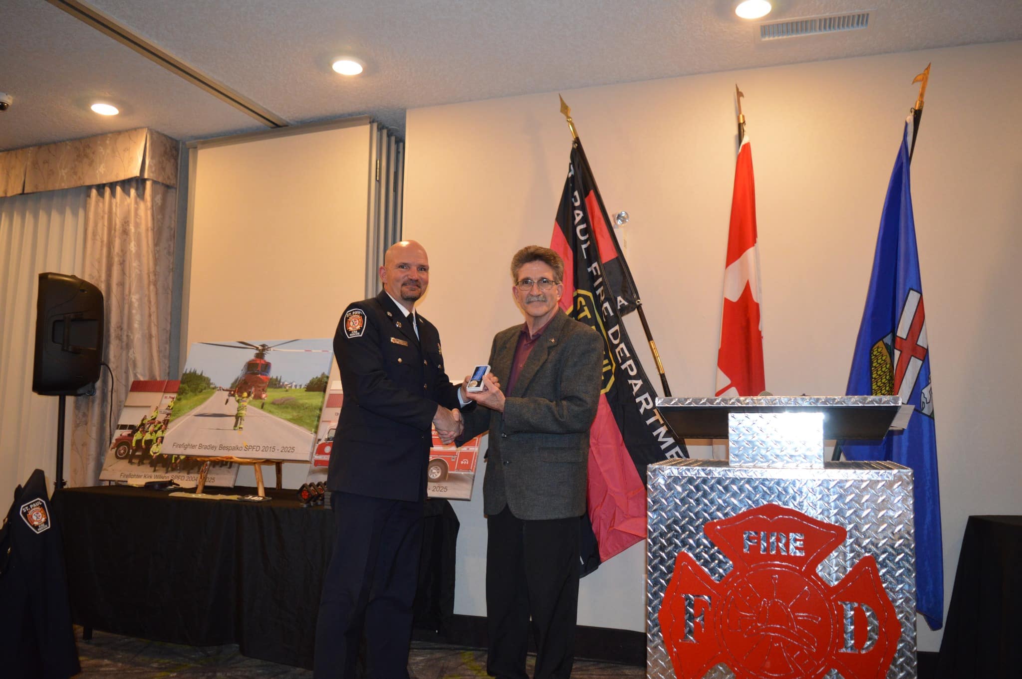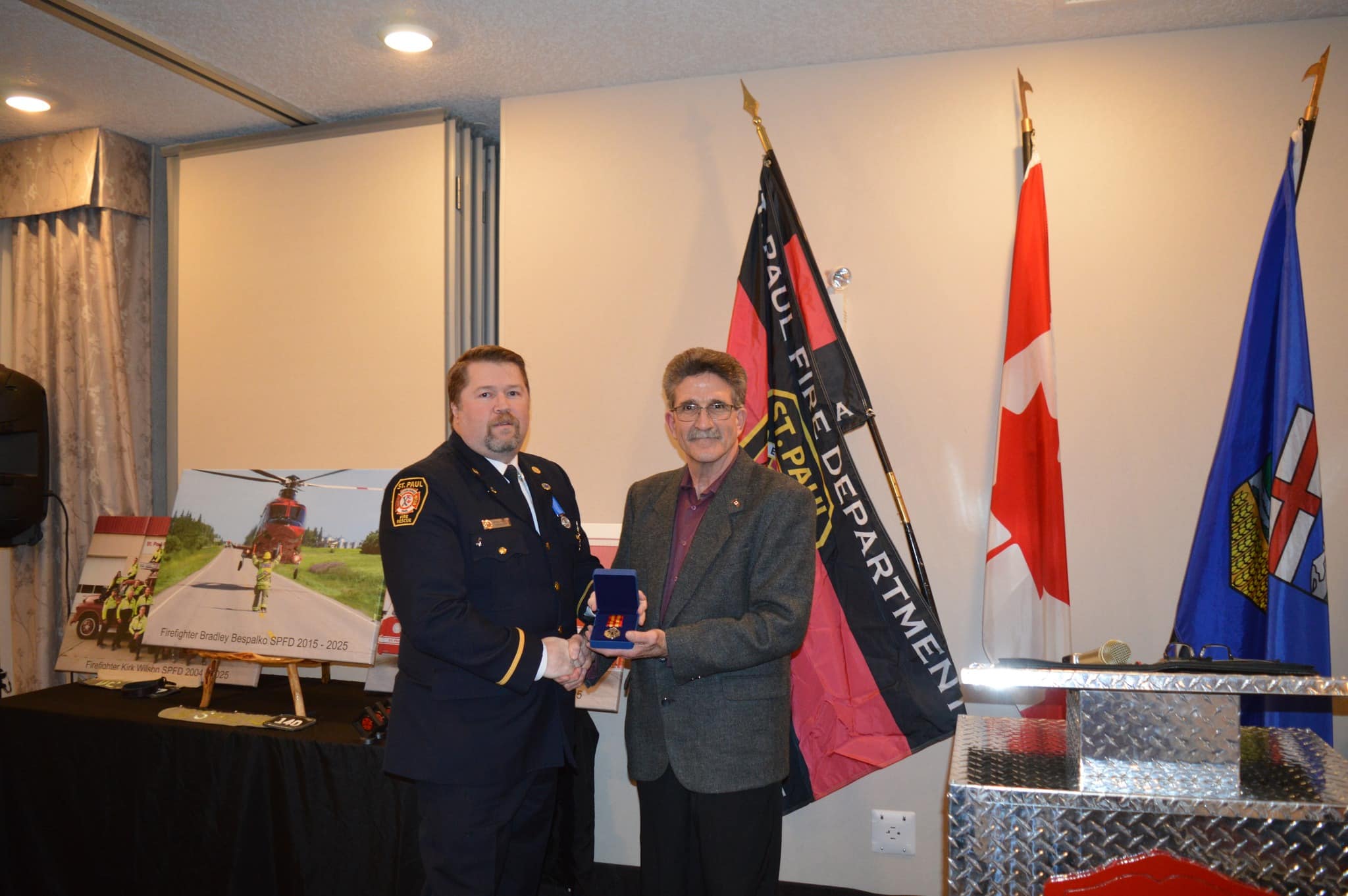 Two members of the St. Paul Fire Department were presented with the Alberta Emergency Services Medal (AESM), an honour recognizing emergency responders who have completed at least 12 years of service to Albertans.